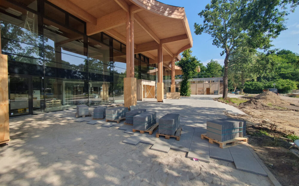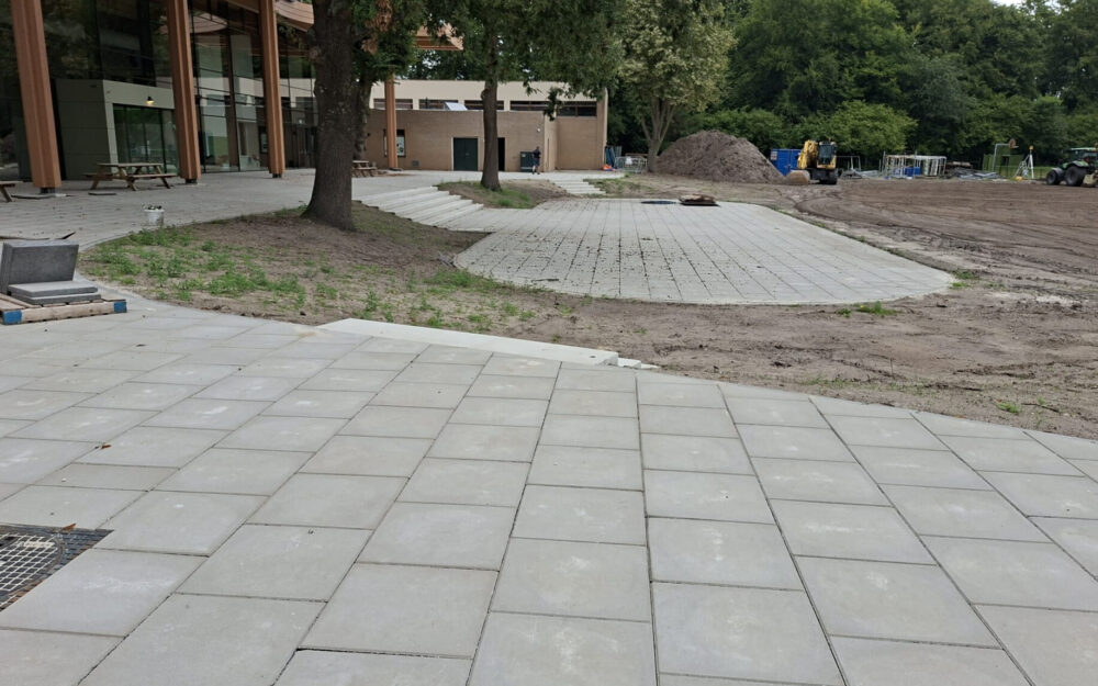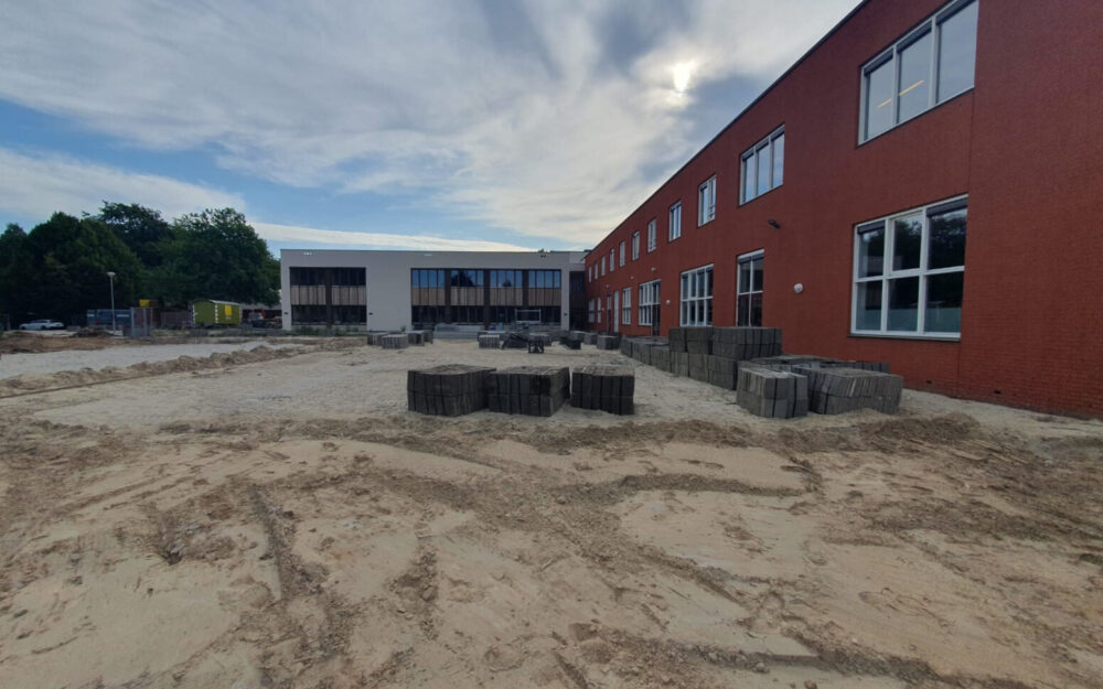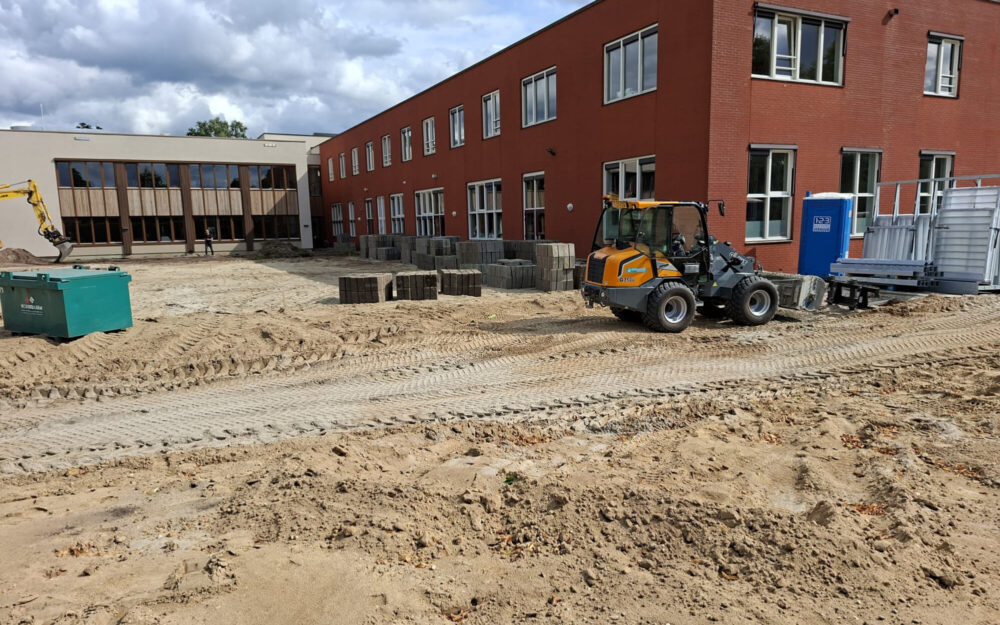 Na de bouwvak voerden we fase 2 uit, dat is aan de achterzijde van het gebouw. Er stond nog een noodgebouw, dat wordt weggehaald. Hier komt de parkeerplaats voor leerkrachten, ouders en bezoekers. Verder leggen we plantvakken aan die in het najaar worden beplant, voor een groene leefomgeving.
