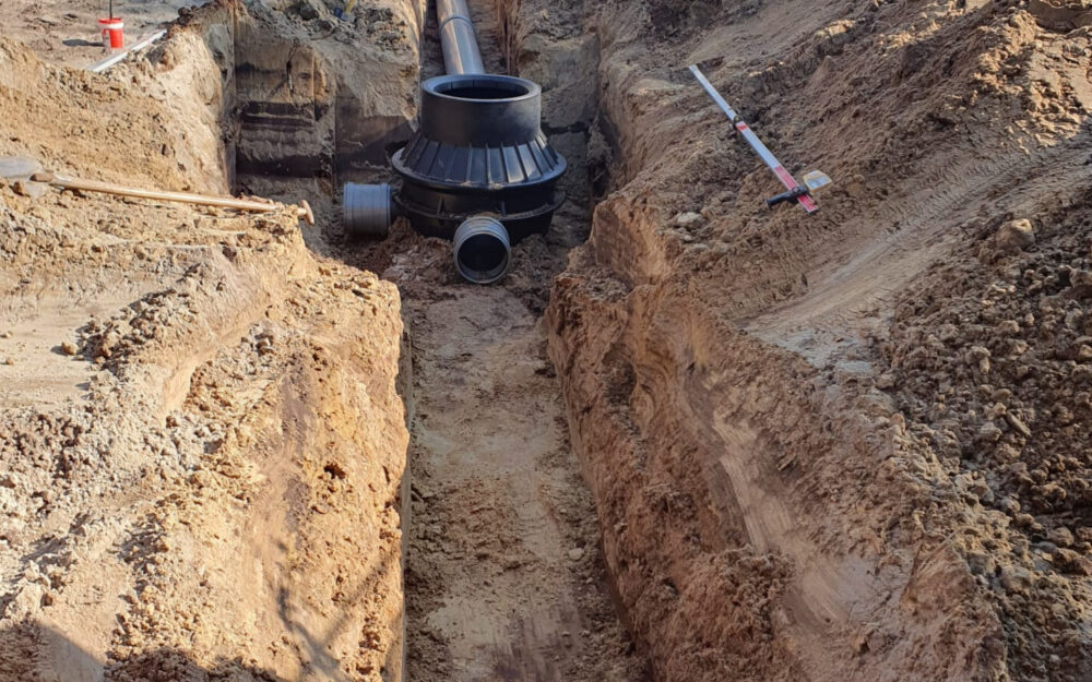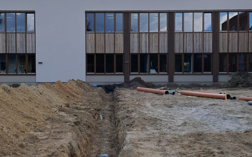 Voor de bouwvak 2025 ruimden we de bouwwegen op en de opslag van de bouw. Dit bestond uit menggranulaat en moest in de oude staat worden hersteld. Vervolgens legden we de riolering aan: een gescheiden afvoer van vuil- en schoonwater met de aansluiting tussen het gebouw en de hoofdriolering van de gemeente.